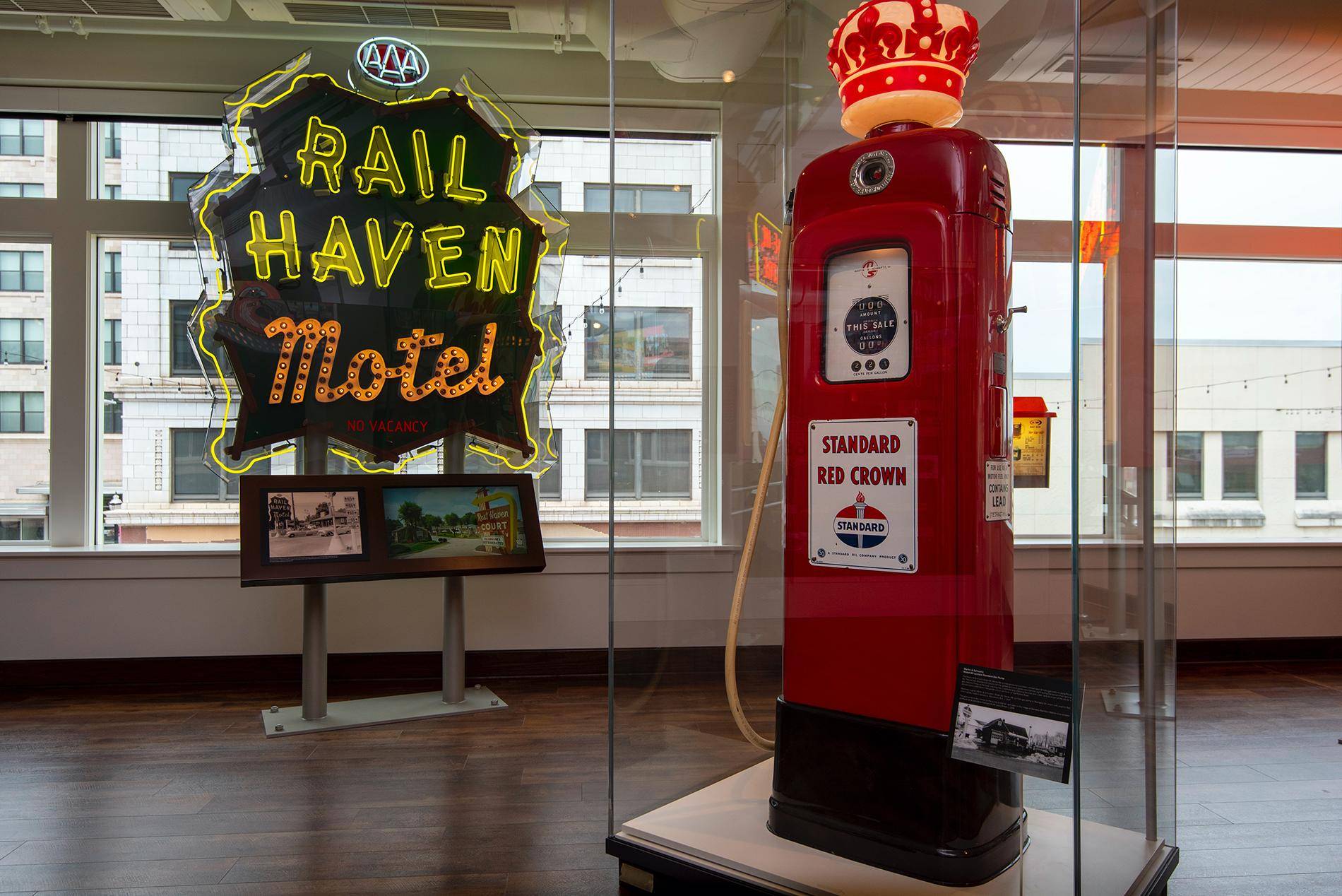 - Enjoy fun interactive neon sign exhibits featuring local Route 66 icons like Red's Giant Hamburg, Sanders' Standard Oil gas station, and Sunset Drive-In Theatre. The Rail Haven Motel interactive is especially popular because this famous motel is still open, courtesy of Elliott Lodging