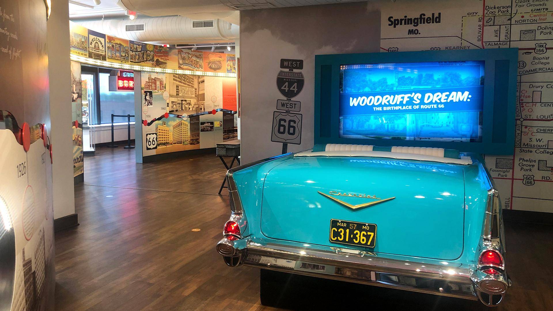 Hop into the turquoise blue '57 Chevy Bel Air convertible at the John T. Woodruff Theater and learn about the Springfieldian who helped give Route 66 its name.