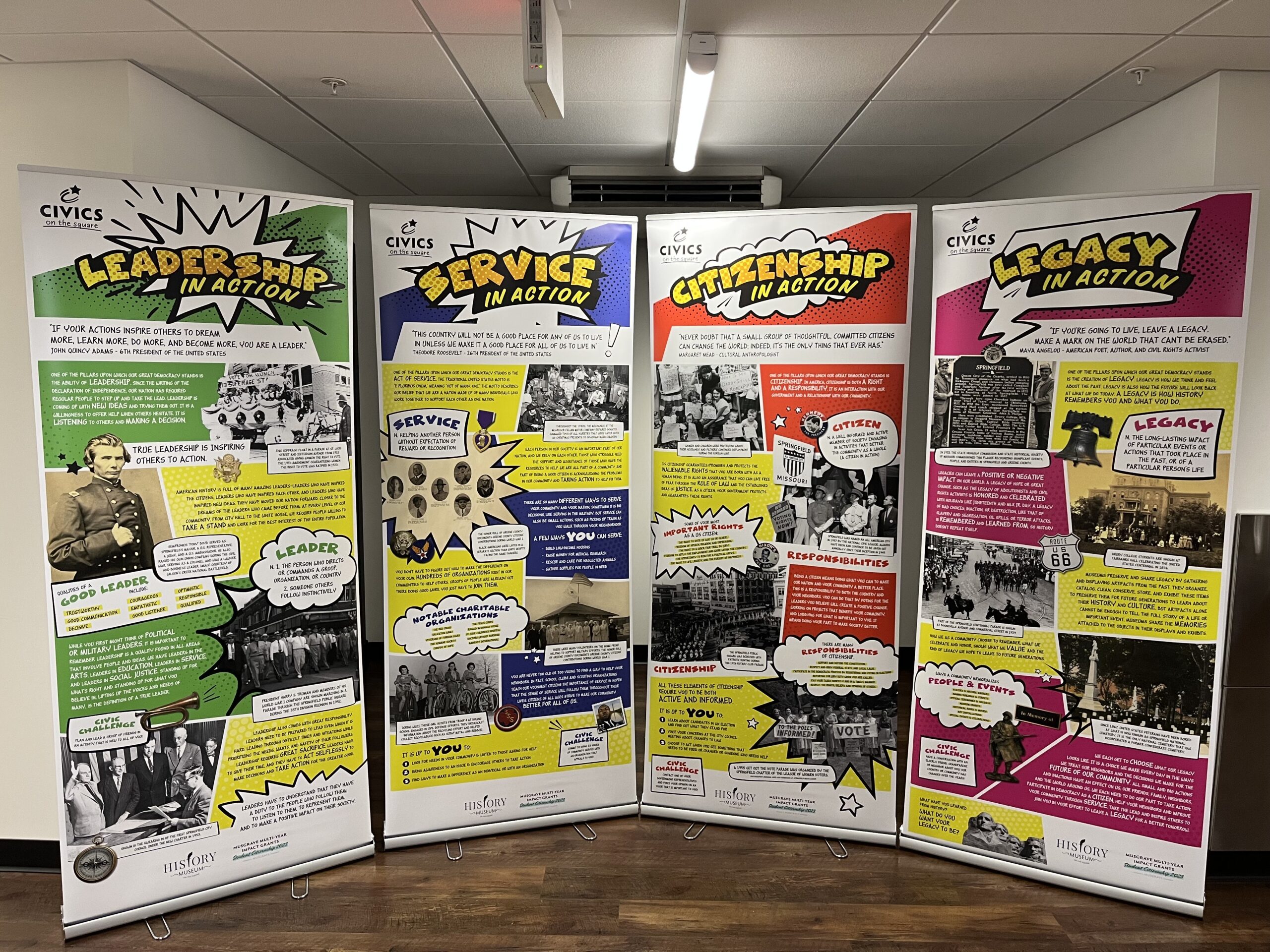 The History Museum on the Square is excited to showcase the history of civic engagement in Springfield through this educational display. These 4 panels are a modified display from our 2024 Democracy in Action exhibit that highlighted the civic history of Springfield. The included panels explore this through the four pillars of democracy – citizenship, service, leadership, and legacy. Additionally, this kit features video and activity resources for students to engage with as they learn.
