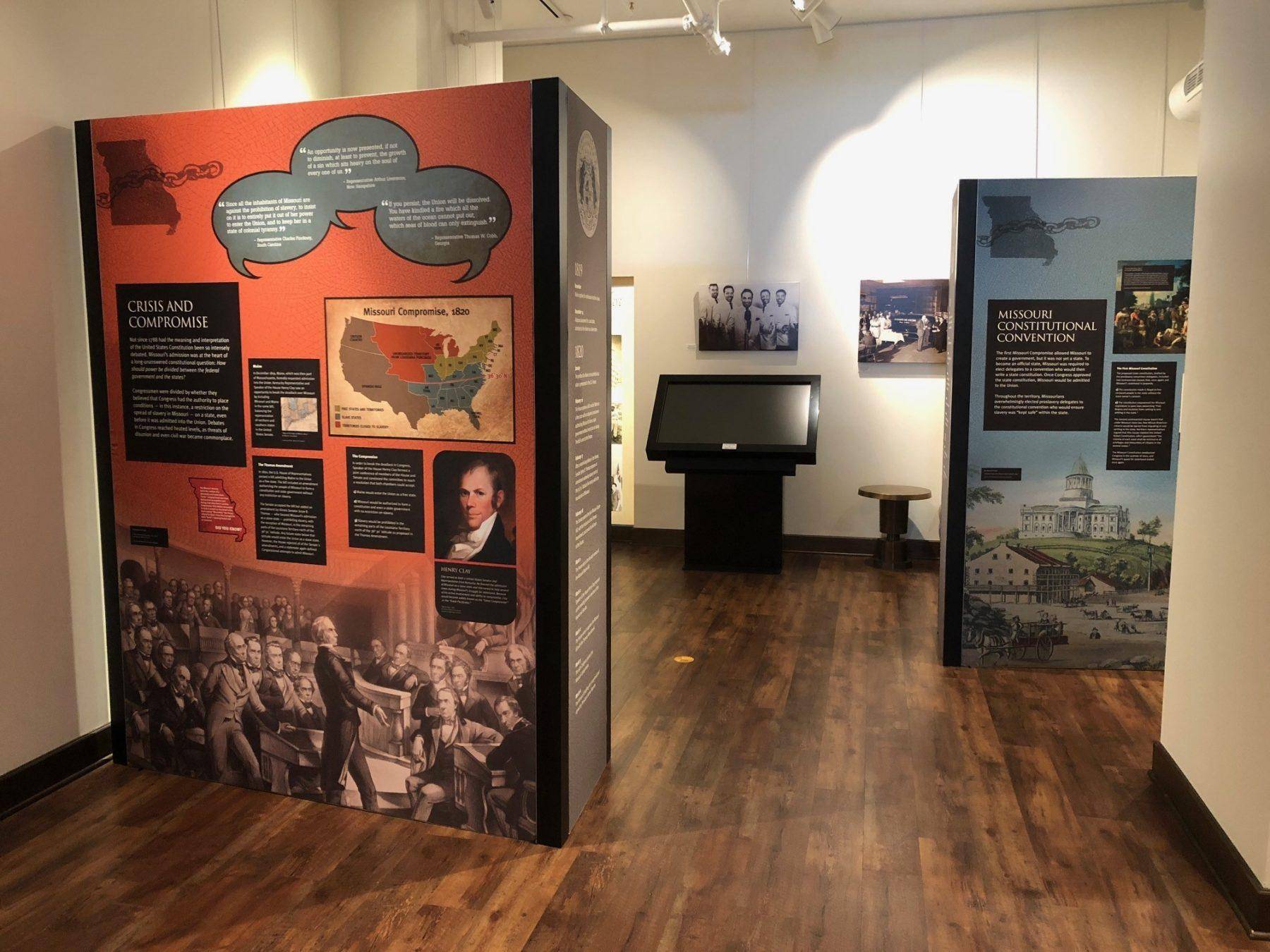 The front entrance to the VOH gallery features a large high-definition monitor displaying our increasing list of generous museum donors. A reproduction mid-century modern chandelier lights this area of the gallery. Modern benches and end tables remind visitors of the textures and colors once found in the beloved Barth's men's department store long ago, which now houses the main part of the museum. The video kiosk at the back of the gallery plays history-themed videos or exciting digital presentations that are part of our temporary exhibit displays.